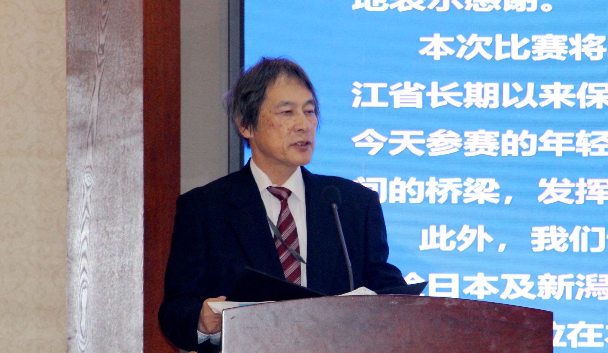 梅津雅之代理事长中山辉也先生转达了对各位来宾的问候。他说,佳木斯地区曾是三江平原开发技术合作的重要基地,由新潟県杰出人物佐野藤三郎先生牵头开展相关项目。同时,在佳木斯大学设立的“新潟馆”,致力于推进两国友好交流,对此深表谢意。希望各位参赛选手能以本次比赛为契机,在未来作为新潟県与黑龙江省之间的桥梁,发挥重要作用。